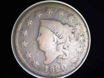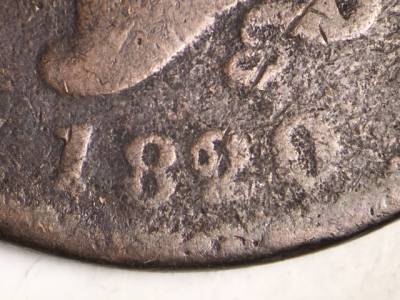 1820/19 Small Date. 2 Overlapping slightly right of 1. Lower curve of 9 under lower left of 0. Note: Underlying 9 not visible on pictured coin due to condition.
