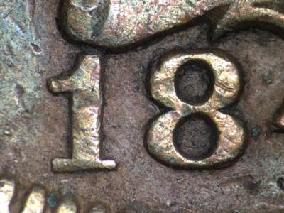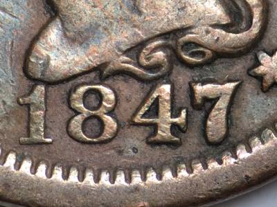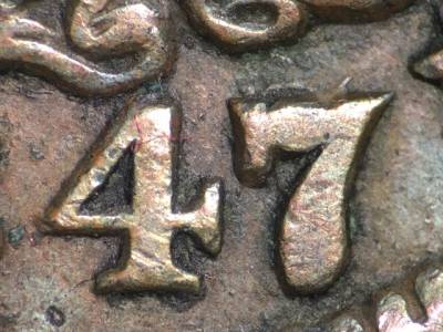 Large 7 over Small 7. Repunching to the north above the 47. Repunching to the south on the 1 visible in earlier die states. Note: Coin pictured is Stage C (Newcomb-31, no die cracks).