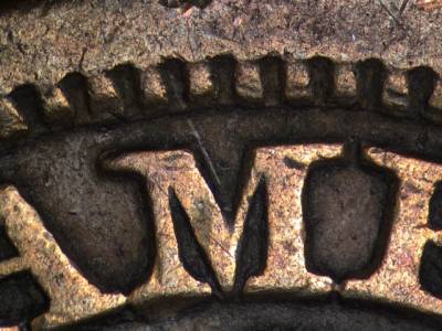 Reverse: Stage A: N2. None known. Stage B: N2. Die crack formed that runs from the rim above The A in AMERICA, through the top left edge of the M, and through ER. Stage C: N31. Reverse die changed. No die markers known. Stage D: N31. Die cracks formed. Crack runs from the rim above the M in AMERICA, through the top right of the M, and through ER. Die crack runs from the rim to the left of the U in UNITED and through UNITED. Die crack runs from the rim to the left of the first S in STATES to the left side of the S.
