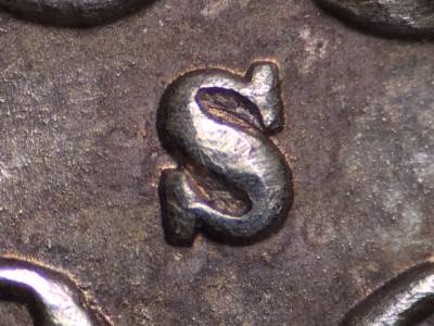Reverse: Reverse is SRPM-001, S/S South in upper loop. Many N-S die scratch to the left of the eagle. Die scratches on the eagle's neck and in the right wing-neck gap.