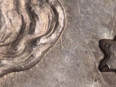 Obverse: Die scratch between the fifth and sixth star. Die scratch between the seventh star and the E in E PLURIBUS UNUM. Die scratch above the right side of the N in UNUM. Die scratch between the U and M in UNUM. Short die scratch extends from the hair to the left of the tenth star. Die scratch below the eye. Die scratches behind the upper hair curl.