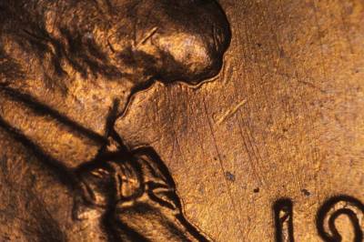 Numerous mostly north to south die scratches throughout the fields on the obverse. Heavy NNW to SSE die scratches left of and through the date running toward Lincoln’s chin. Small die gouge (dot) above 3 in date.