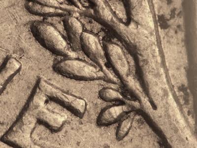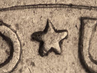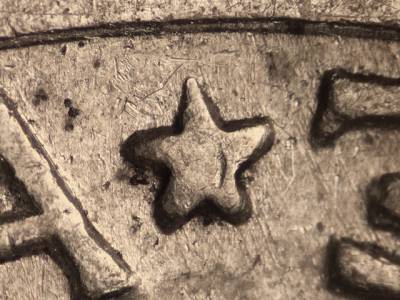 Light Class VI and very close Class II doubling on outer lettering and lower leaves. Notching visible on the left star and the middle crossbar of the E in UNITED. Extra thickness visible on stars and lower leaves.