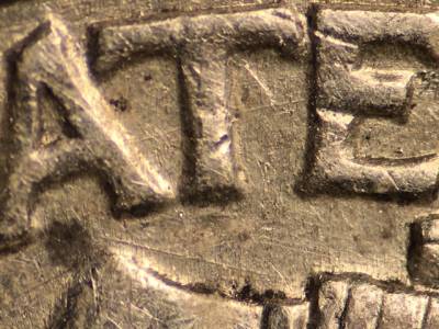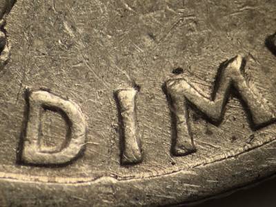 Reverse: Strong die scratch above the axe head. Die scratch through the ATE in STATES. Many die scratches through DIME.
