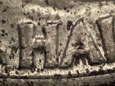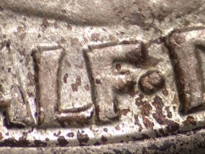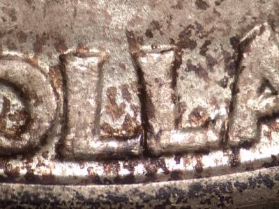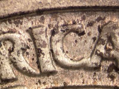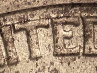 Obverse: Die scratch extends SW from the E in WE.