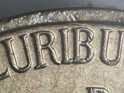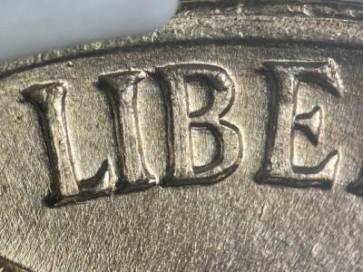 Many crisscrossing die scratches below the chin and in front of the neck as well as through the UST in TRUST and in front of the forehead. Large die gouge touches the bottom left side of the 4 in the date. Small die gouge near the rim above the L in LIBERTY, Small die gouge below the left side of the E in LIBERTY.