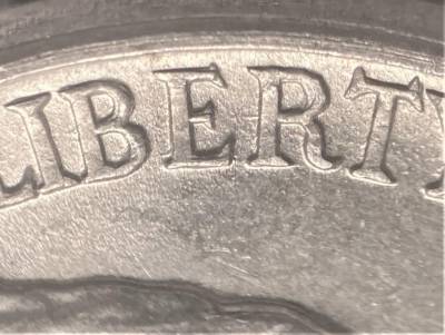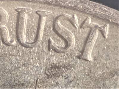 Die crack running through Jefferson’s hair and toward rim. Master die doubling present on TRUST and LIBERTY.