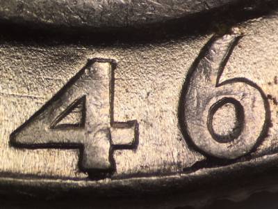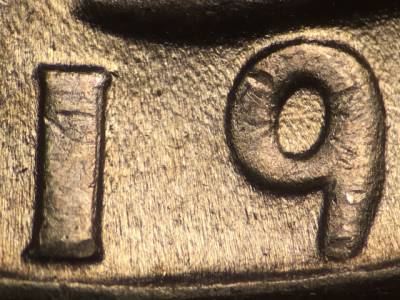 Obverse: Horizontal die scratches through the 4 in the date. Die gouge to the right of the bottom of the B in LIBERTY. Die scratch runs through the bottom of the R in LIBERTY.