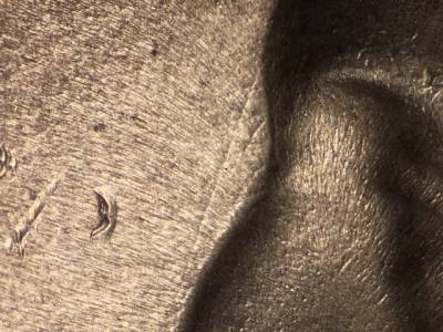 Moderate Class VI doubling towards the rim on all lettering and the lower leaves and branches.