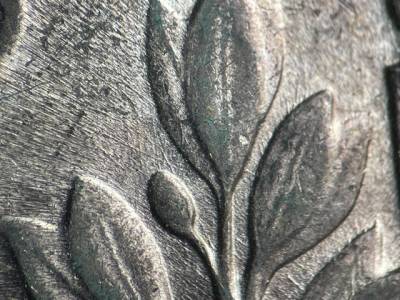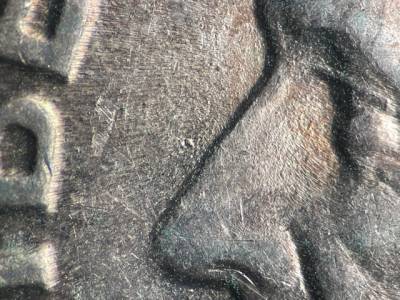 Short N/S die scratch left of the ear. Die gouge in front of the nose. Die gouge near the rim left of the I in IN.