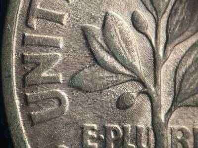 Strong NE/SW die scratches through UNITED and the olive branch. Crisscrossing die scratches above the upper olive and right of the flame. Old die scratch in the lower left opening of the M in DIME. Die gouge between the last S in STATES and the O in OF. Die gouge between the O and F in OF.