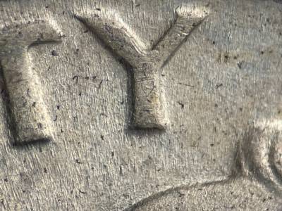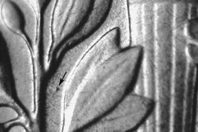 Obverse: WDDO-??? Class II doubling on designers' initials and the date. Thin N/S die scratches in front of the mouth and eye. Long die gouge overlaps the 1 in the date. Smaller die gouge left of the 1. Die gouge below the left side of the Y in LIBERTY.