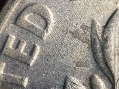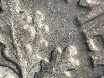 Reverse: Long NE/SW die scratch below the ED in UNITED. Curving N/S die scratch right of the upper olive leaves. NW/SE and N/S die scratches through the olive branch stem and EPU. Die scratch runs from the bottom right corner of the last A in AMERICA to the E in DIME. X-shaped die scratches between the upper and upper right oak leaf clusters. Die gouge between the lower right olive leaf cluster and the branch.
