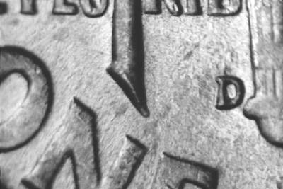 Type I, WDDO-??? Die scratches south by east from the bust positioned above the 9 and 4 in the date. Die scratch NW from the upper right inside of the N of IN. Doubling shows on the designer’s initials.