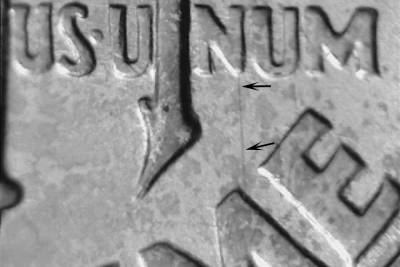 Die scratch north from the upper right of the M in DIME to the lower right of the N in UNUM.