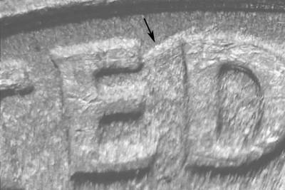 Reverse: Abrasion gouge ENE/WSW between the top of the E and D in UNITED.