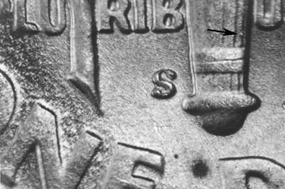 Knob tail mintmark. Triangular shaped die gouge south of the mintmark and west of the bottom of the torch base. Die chip on the right side of the torch base slightly above the bottom band.