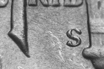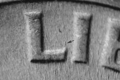 Knob Tail Mintmark. Die scratch south from the lower right side of the second U in PLURIBUS. Die scratch NNE/SSW between the dot and the first U in UNUM.