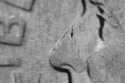 Die crack west from the torch holder (above the bands) to the upper right hand olive leaves.