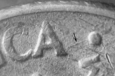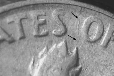 Stage A: Die crack south from the rim at about 12:15 o’clock stopping between STATES OF. Die scratch ENE from right center of the last A in AMERICA to the dot.