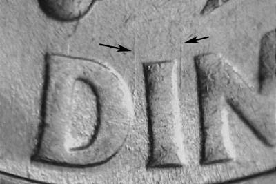N/S die scratch between the upper area of the D and I of DIME. N/S die scratch between the upper area of the I and M of DIME. Die scratch SE from the upper right side of the E in DIME. Die scratch south from the lower right side of the torch flame. Die chip on the olive stem above the R of PLURIBUS.
