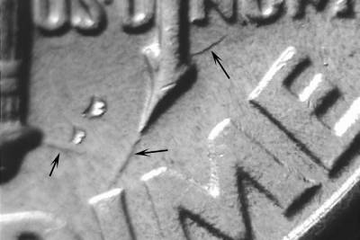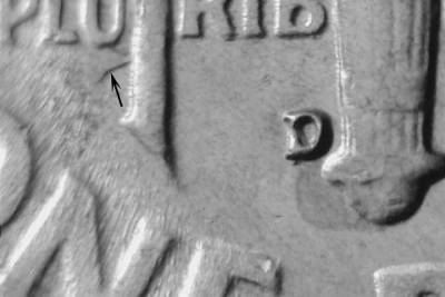 Die clash below the first U in PLURIBUS. Die clash at the bottom of the oak stem.
