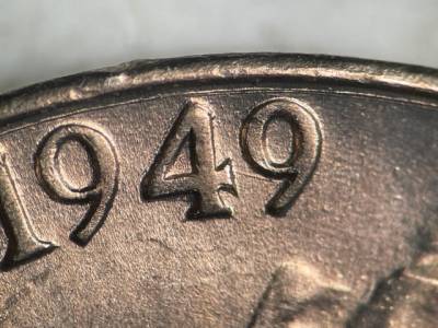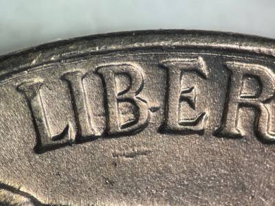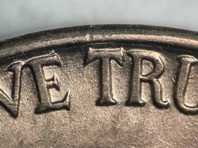 Strong concentric die scratch near the rim around much of the obverse. NW/SE die scratch inside the lower opening of the R in TRUST. NW/SE die scratch connects the 4 and 9 in the date. Die gouge between the E in WE and the rim. Large die gouges through and below the B in LIBERTY.