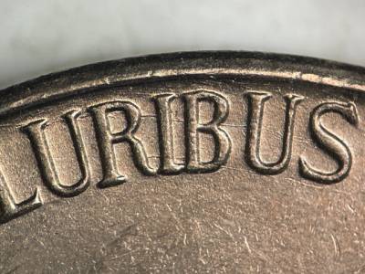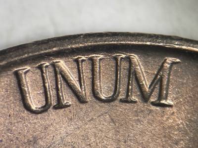 Strong NW/SE die scratches through URIBUS. Strong E/W die scratches through UNUM. Strong NW/SE die scratches through the NIT in UNITED and the STA in STATES.