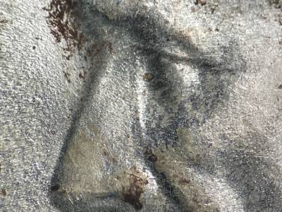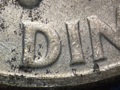 NW/SE die crack across the back of the head. Die clash in front of the eye. Multiple die gouges above the 4 in the date.