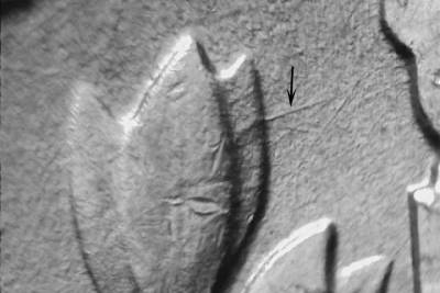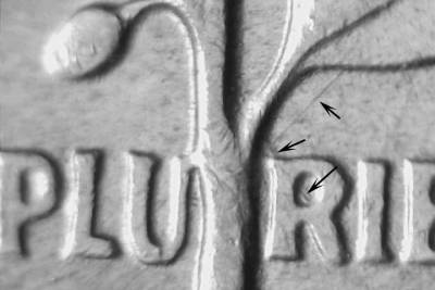 Die scratch NW from the inside of the R in PLURIBUS. NW/SE die scratch above the R in PLURIBUS. Die crack from the rim at 5:00 o’clock that runs through the left side of the M in DIME to the base of the torch holder. Die scratch ENE from the right side of the upper olive leaves.