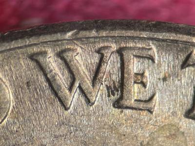 Obverse: Die scratch extends SE from the rim above the W in WE. N/S die scratches in front of the face. Die scratch extends N from the back of the head below the E in LIBERTY. NW/SE die scratch below the Y in LIBERTY. N/S die scratch below the date.