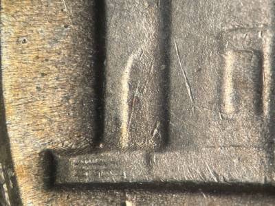 Reverse: Many NE/SW die scratches through and below the UN in UNUM. Three short NE/SW die scratches in the left arch. E/W die scratches through and below the CEL in MONTICELLO. E/W die scratches through CENTS.