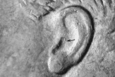 Short die scratch north from the lower area of the forehead. N by E/S by W die scratch inside the ear at left center. Reverse: