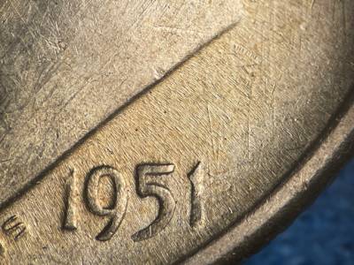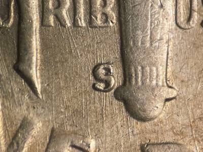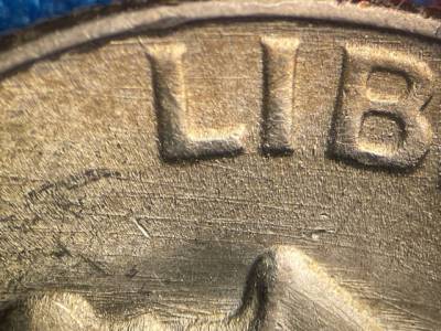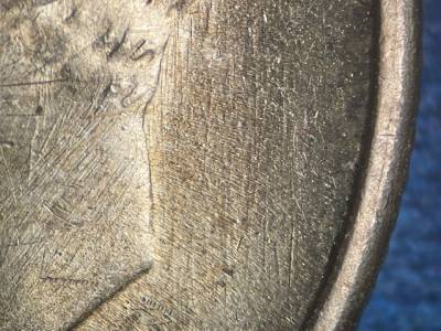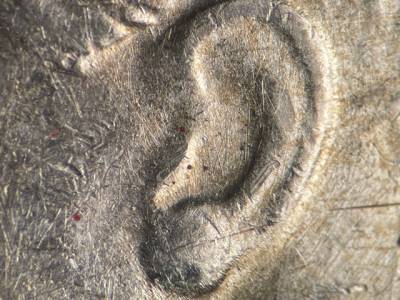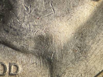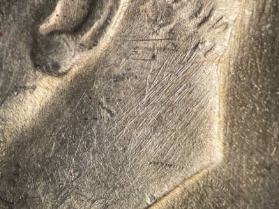 Strong N/S die scratches throughout the fields and on the throat. Strong NE/SW die scratches on the back of the neck. X-shaped die scratches inside the ear. Numerous small die gouges above IN GOD.