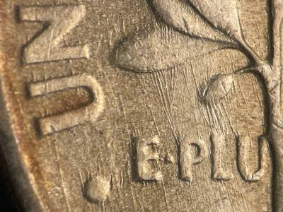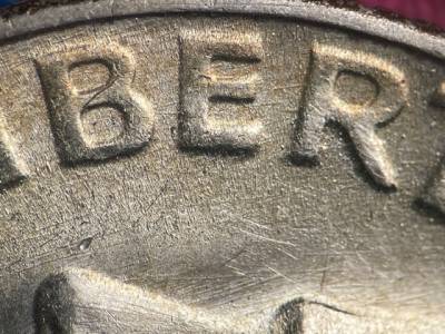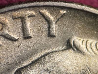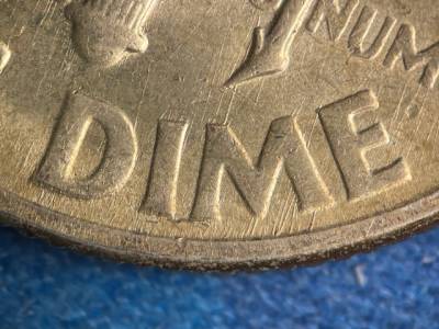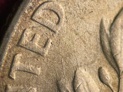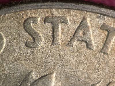 Strong N/S die scratches through the olive branch and ONE DIME. Two strong N/S die scratches below the ER in AMERICA. Short die gouges between the leaves of the oak leaf cluster that overlaps the torch. Numerous small die gouges around the TED in UNITED.