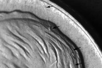 Obverse: ESE/WNW die crack on the upper front of the hair. Die crack SSE from the rim at 12:45 o’clock running slightly into the hair to a die chip and then turning SE along the hair.