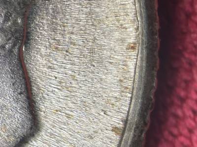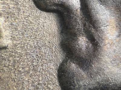 Old die dent at the rim at 3 o'clock. Die scratches extend NW from the chin and lower lip. Die scratches extend SW from the brow. Short die scratch extends N from the forehead. Two die gouges E and S of the die dent at the rim.