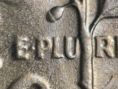 N/S die scratches through the lower olive and the L in PLURIBUS. Die scratches extend N from the upper olive leaves. Strong N/S die scratches to the right of the flame. N/S die scratches along the lower right side of the torch. Die gouge below the mintmark.