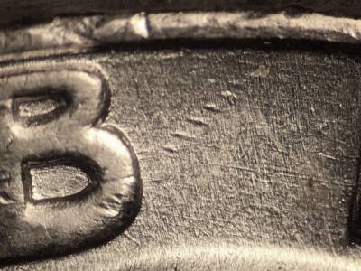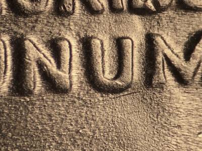 Reverse: Stage A: Die scratch runs northeast from the bottom right of the bell. Numerous die scratches above the right side of the bell. Numerous die scratches through the HA in HALF. Stage B: Stage A markers worn away. Die scratch below the second U in UNUM.