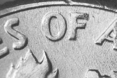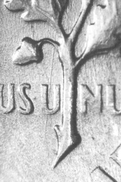N/S die scratch, nearly centered, inside the O in OF. Die scratch S by W from the left lower oak branch through the first U in UNUM.