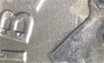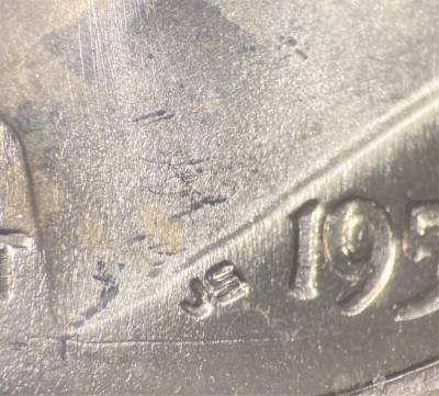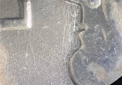 Heavy die scratch running east to west from under the bust to under JS and the 19 in the date. Die scratch running north from the nose to E in LIBERTY. Multiple north to south die scratches under the nose.