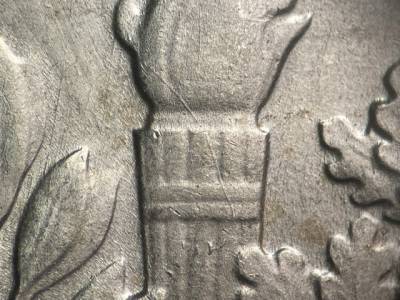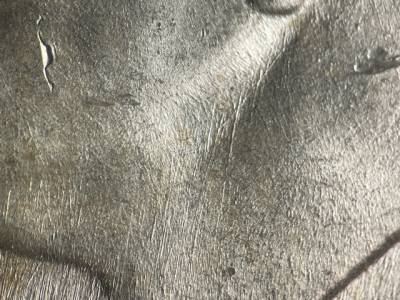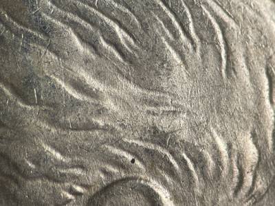 Thin E/W die crack on the nose. Strong mostly N/S die scratches throughout the fields, on the neck, and in the hair. Strong X-shaped die scratches behind the head. Strong die scratch connects the bottom left corner of the D in GOD and the first T in TRUST. Strong die scratch extends S from the N in IN. Die gouge below the E in LIBERTY.