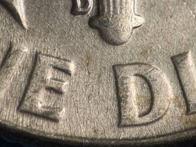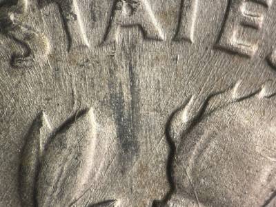 Strong slightly curved die scratch on the upper torch and the flame. NW/SE die scratch through the UN in UNITED. E/W die scratches through the TED in UNITED. Die scratch extends SW from the I in AMERICA to an oak leaf. Old E/W die scratches through the CA in AMERICA. Irregular die gouges on the torch between the tops of the overlapping leaves. Short die scratch extends NE from the rim below the D in DIME. Die gouge below the E in UNITED. Die gouge below the C in AMERICA. Many N/S die scratches through and above the olive branch.
