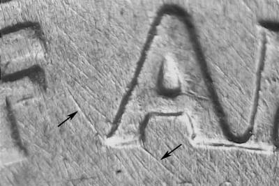 Reverse: Die scratch NNE from inside the left upright of the first U in UNUM located slightly above center. Die scratch S by E from the right upper side of the S in PLURIBUS running through the dot. Die scratch NE from the left lower side of the first A in AMERICA.