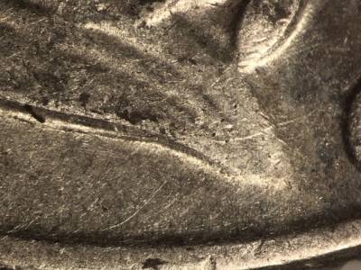 Obverse: Two concentric die scratches through the LI in LIBERTY.