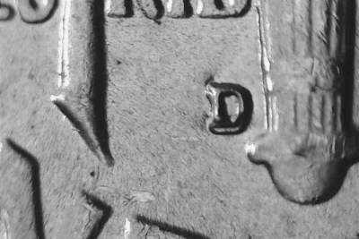 Die scratch ENE from the lower right of the E in ONE to the D in DIME.