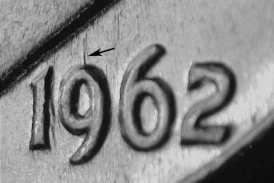 NNW/SSE die scratch from the lower lip to the nose. Die scratch north from upper center of the 9 in the date.