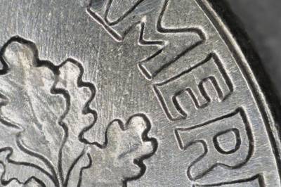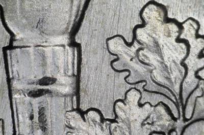 Many N/S die scratches throughout the fields. Strong NE/SW die scratch runs along the right side of the E in ONE and intersects the mint mark. Strong die scratch extends NE from the D in DIME. Strong die scratches extend NE from the first dot in EPU. Strong NE/SW die scratch runs from above the right side of the M in DIME, through the second U in UNUM, and to the oak leaves. N/S die scratch connects the E in DIME and the second U in UNUM. X-shaped die scratches between the top of the torch and the upper oak leaves.