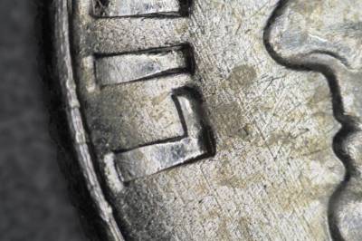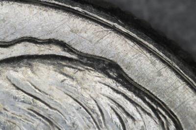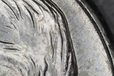 Blunt 9. Strong NW/SW die scratches in the fields behind the head and above the date as well as in front of the head and below LIBERTY. Criss-crossing die scratches from the rim at 1 o'clock. Strong die scratches extend NW from IN GOD.