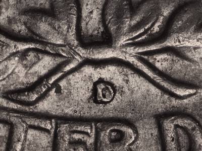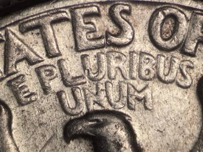 Strong CW Class V spread from a pivot near 9:00 on USA, QUARTER DOLLAR, and E PLURIBUS UNUM.